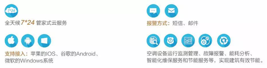 当空调设备在运行过程中出现问题时,能够及时以短信、邮件等方式向公司和用户发出报警,实现智能化维保,大幅缩短公司售后服务的响应时间,延长空调设备的使用寿命,并可根据能耗分析数据给出节能建议,节约用户的运营成本。